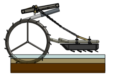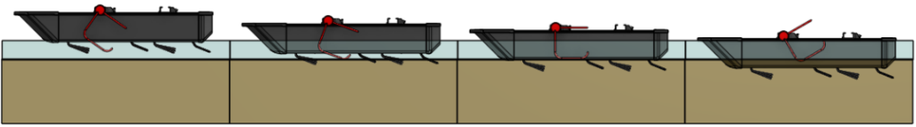 接地具合は、除草フロート側面のインジケーターで確認します(下図)。除草爪・櫛が接地するまでインジケーターは下がりきっていますが、爪・櫛が接地するとインジケーターは上がり始めます。除草フロート底面が田面に密着するとインジケーターは水平になり、爪・櫛の効果が最大になります。それを超えると、除草フロートが田面にめり込んで、泥が稲苗を動かしてしまいます。