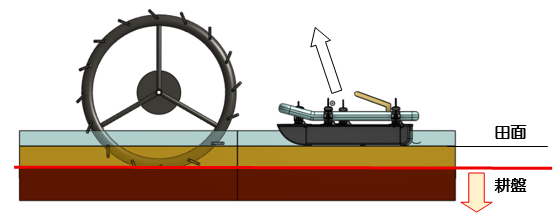 耕盤の深さ(田面から耕盤までの厚さ)が一定でない場合、吊り上げ距離を調節しても除草フロートの接地具合も変わってしまいます。実際には、バネの伸び縮みや接地フロートの浮力、田面からの反力などがり、除草爪・櫛の食い込み深さもあるので、耕盤深に多少の変化があっても、除草効果は得られます。