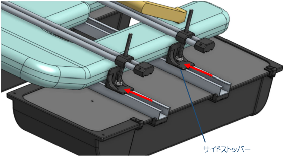 サイドストッパーを田植え機フロートの側面に当て、六角ナットを締めて固定します。