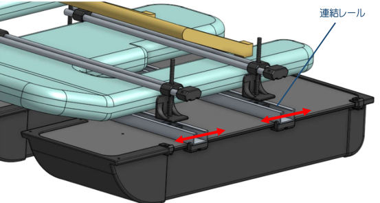 田植え機フロートの形状に合わせて、連結レールの位置を前後にスライド調整し、ネジを締めて固定します。