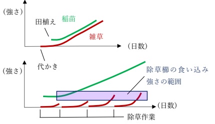 稲苗と雑草の強さにコントラストをつけて、その狭間の強さで除草することです。