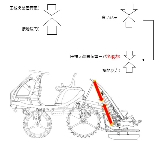 構成 - 除草ユニットと減荷ユニットで構成されます。除草ユニットの除草器具が田面に食い込むにはある程度の荷重が必要になりますが、田植え機の植付け装置は重すぎるので、減荷ユニットで荷重を低減させます。